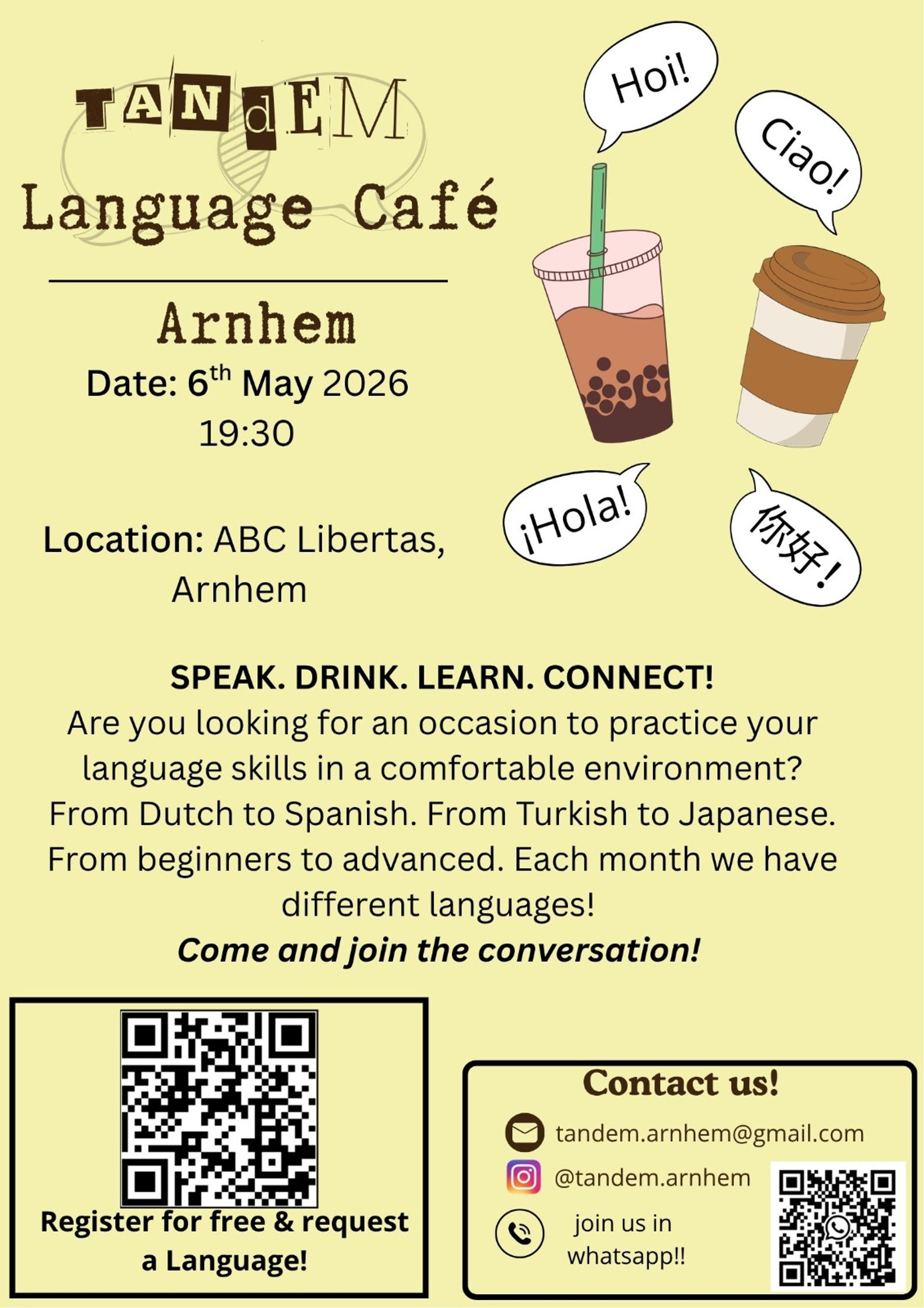 From Dutch to Spanish. From Turkish to Japanese. The Language Cafe is open to people from all language backgrounds and levels. Even if you just want to speak your native language and enjoy a drink.