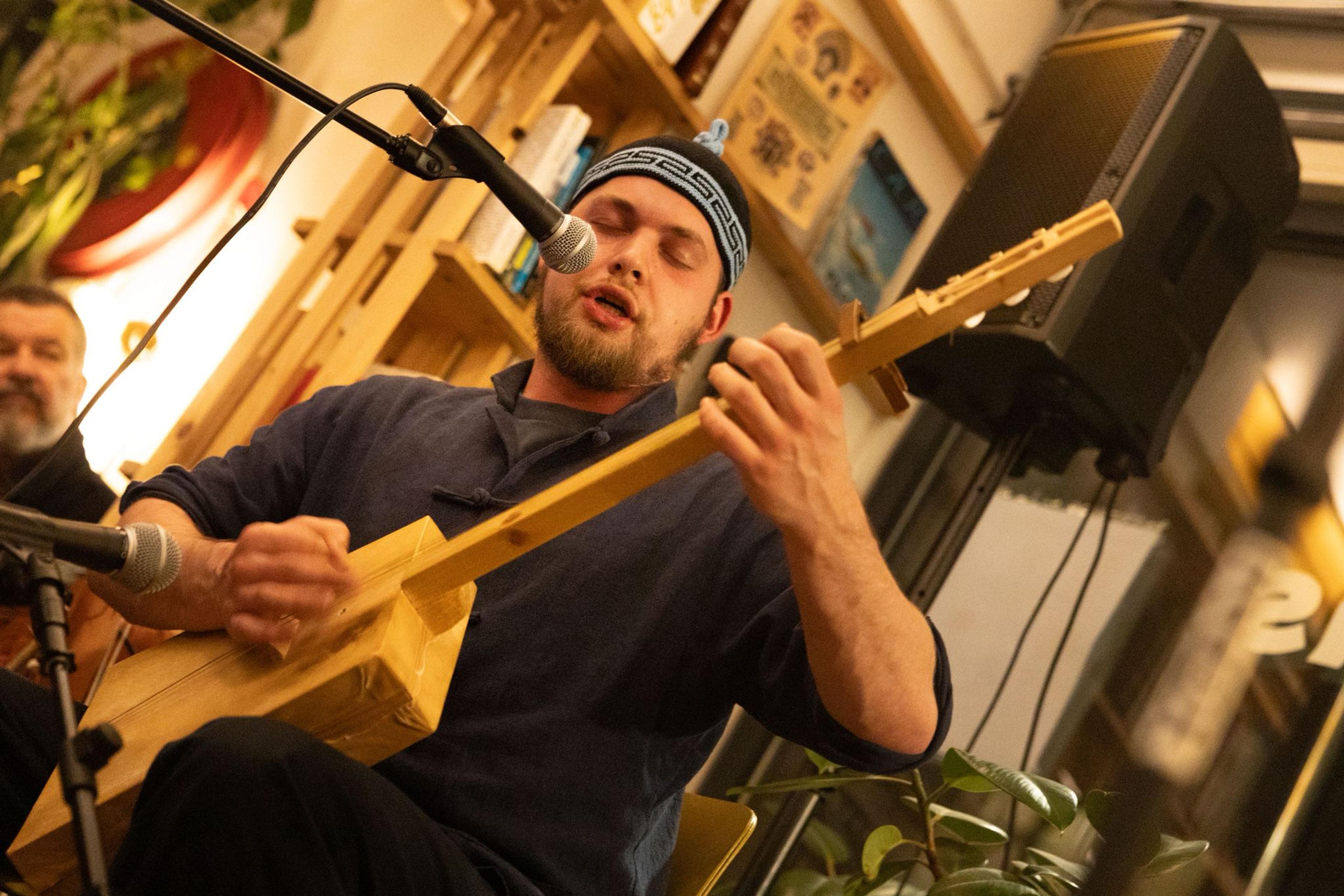 Hidde: "Een klein obstakel aan het spelen van deze muziek is dat de traditionele instrumenten hier nauwelijks te krijgen zijn, omdat het een genre is wat bijna niemand kent. Daarom heb ik zelf instrumenten leren maken en ondertussen heb ik er al vier gemaakt. Één van deze instrumenten is de doshpuluur. Dit instrument lijkt een beetje op een luit. Het is gemaakt van hout, met een stuk gedroogde geitenhuid op de voor- en achterkant. Het geluid geeft een mooie basis om overheen te zingen."